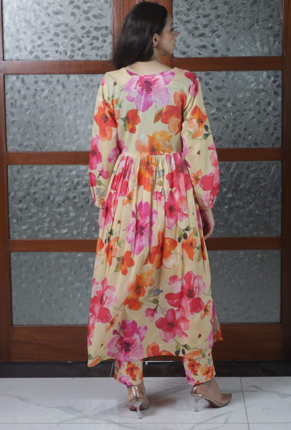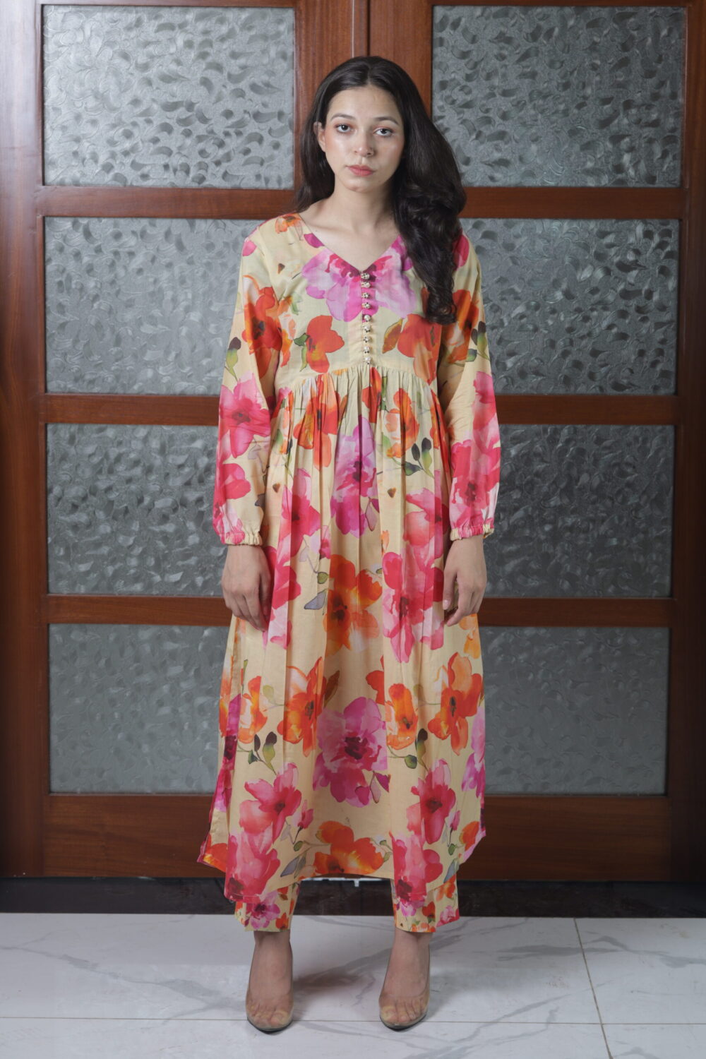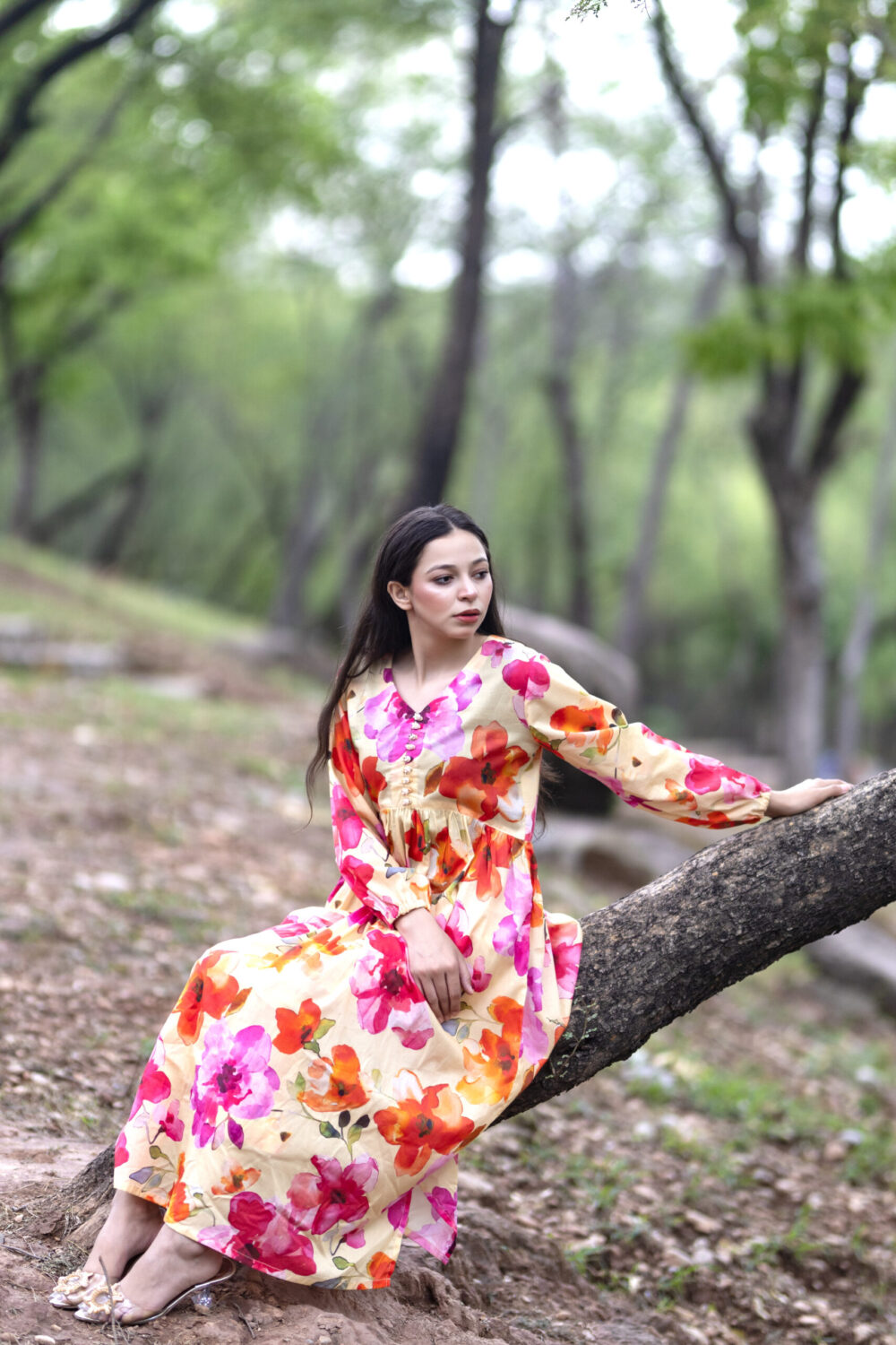 Crafted from premium-quality printed lawn fabric, it promises breathability and softness, making it ideal for warm weather. The flowy silhouette and delicate detailing create a refined, feminine look perfect for both casual outings and semi-formal occasions.