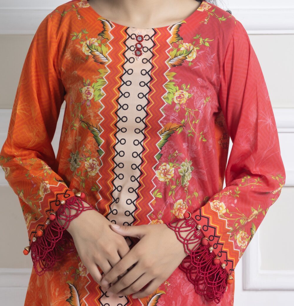 Meri Lado 2 Piece Luxury Printed Lawn Suit. This radiant outfit captures the warmth of summer with a bold, eye-catching blend of fiery