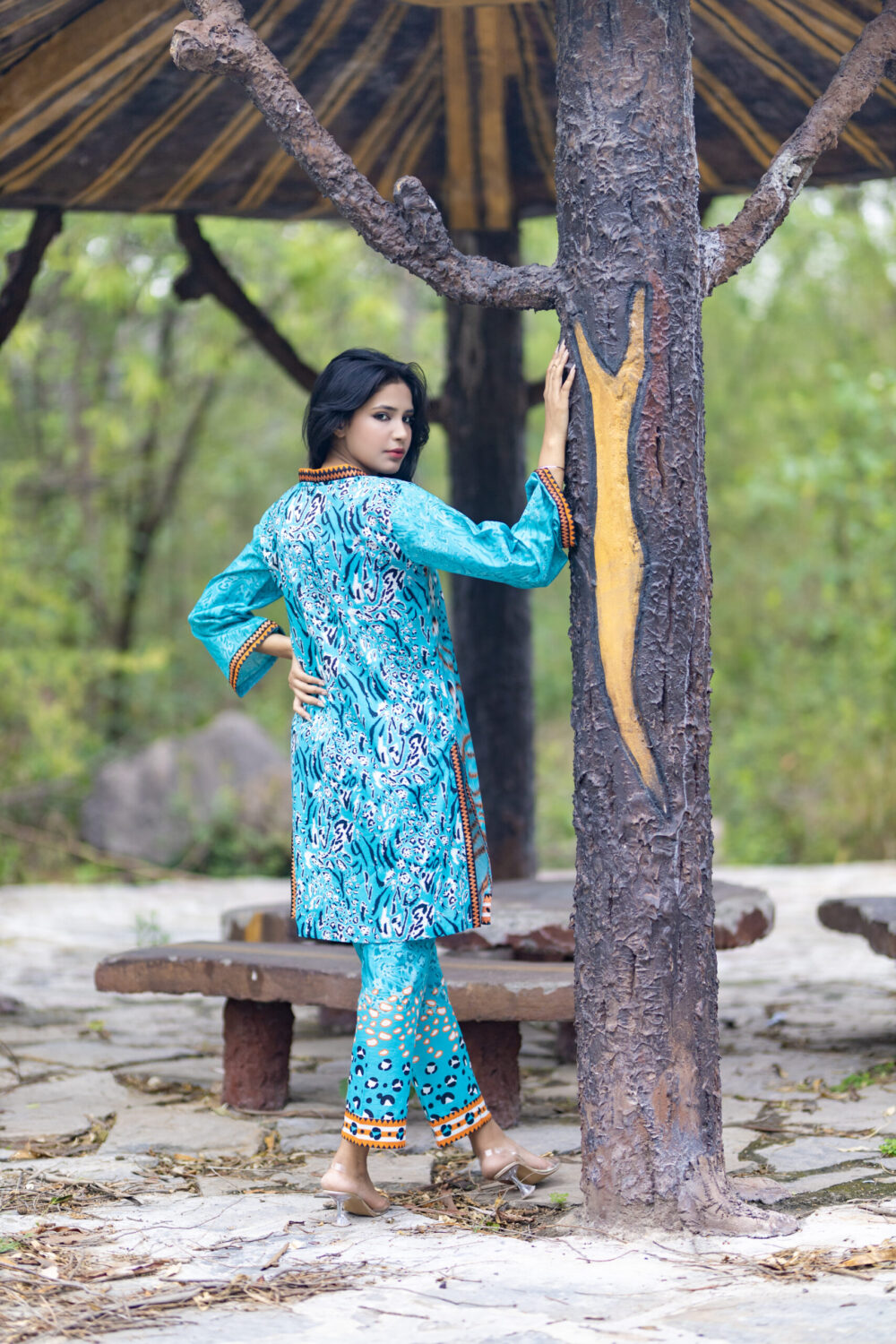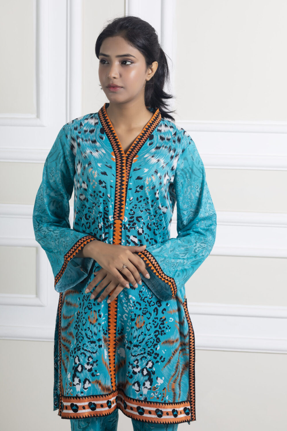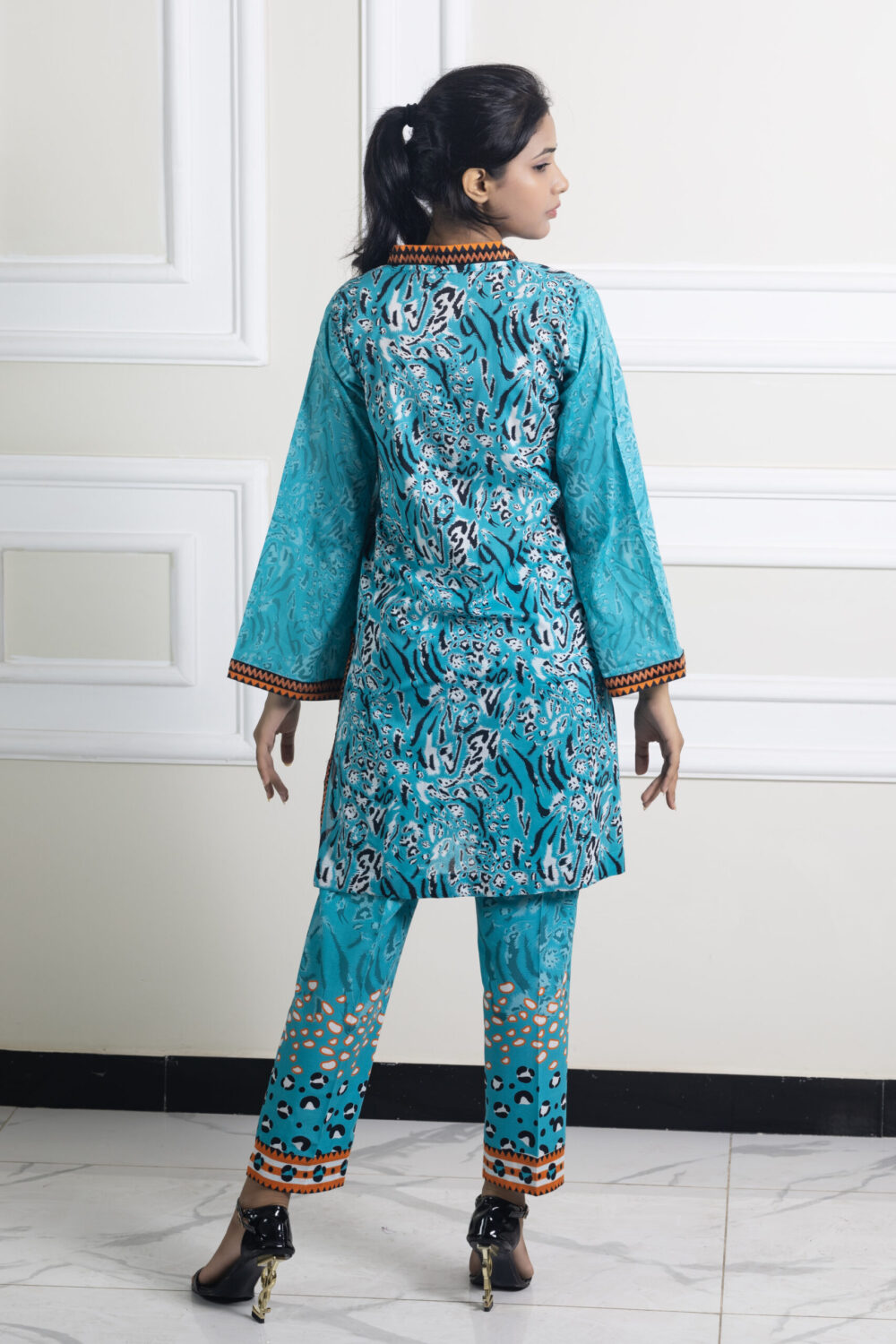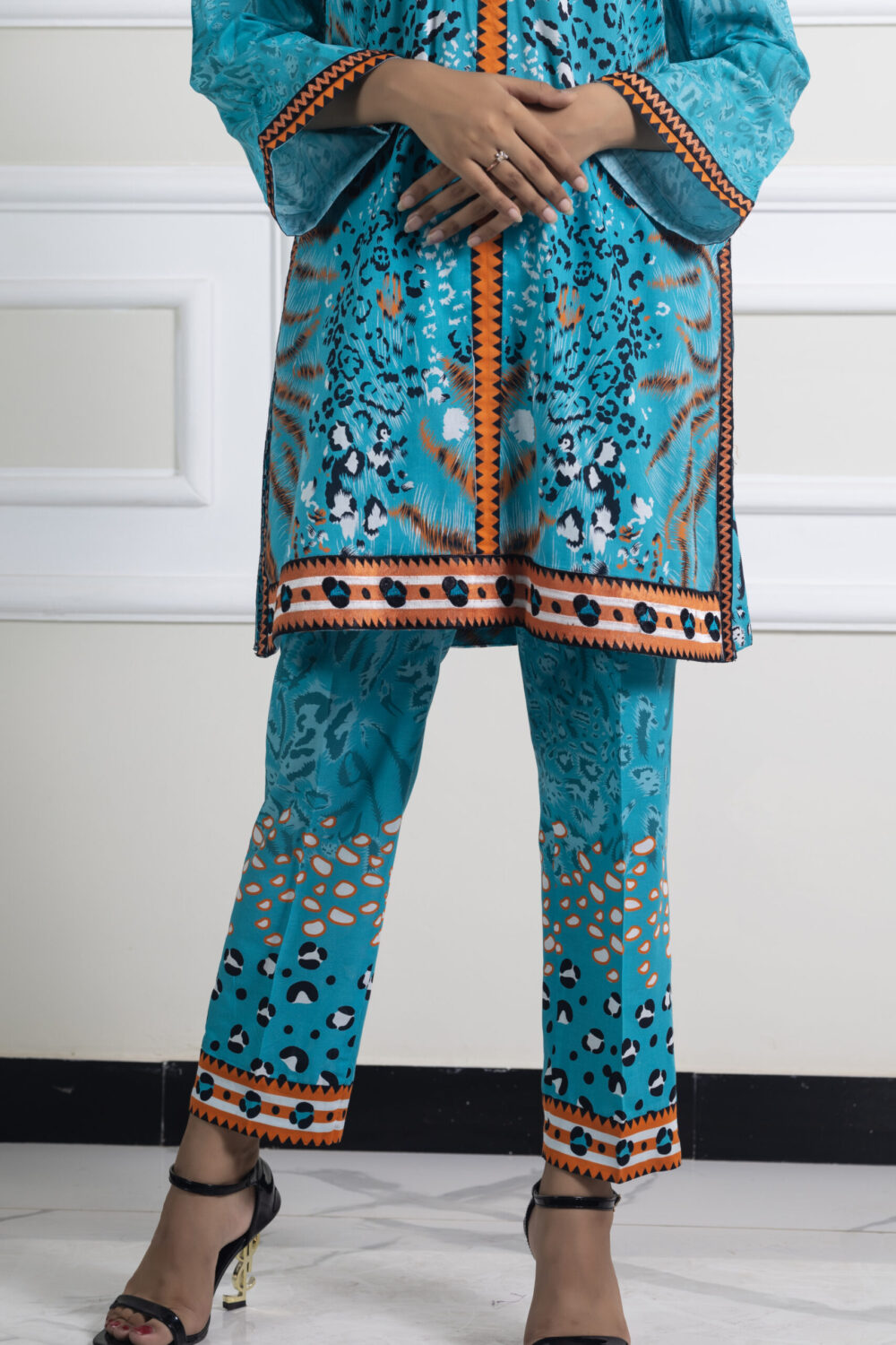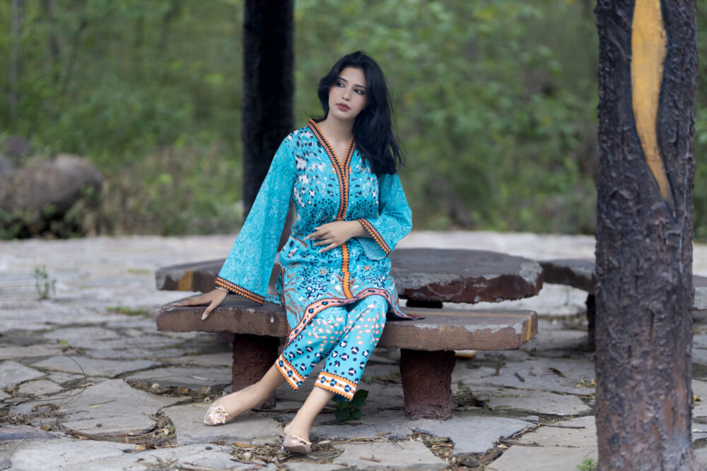 Description: Dive into vivid color with the Meri Lado 2 Piece Luxury Printed Lawn Suit. This breathtaking ensemble features a lively turquoise base with an intricate, culturally-inspired print, beautifully accented by vibrant orange trim detailing along the neckline, cuffs, and hem. It’s an eye-catching suit that perfectly captures a festive, summery spirit. Crafted from premium, breathable lawn fabric, this outfit ensures all-day comfort and a light, airy feel, even on the warmest days. The entire two-piece suit is expertly stitched for an effortless, ready-to-wear fit, featuring a chic short kurti and coordinating printed trousers. Perfect for destination trips, festive outdoor gatherings, or elevating your casual summer wardrobe, this luxury suit is guaranteed to make a memorable statement.