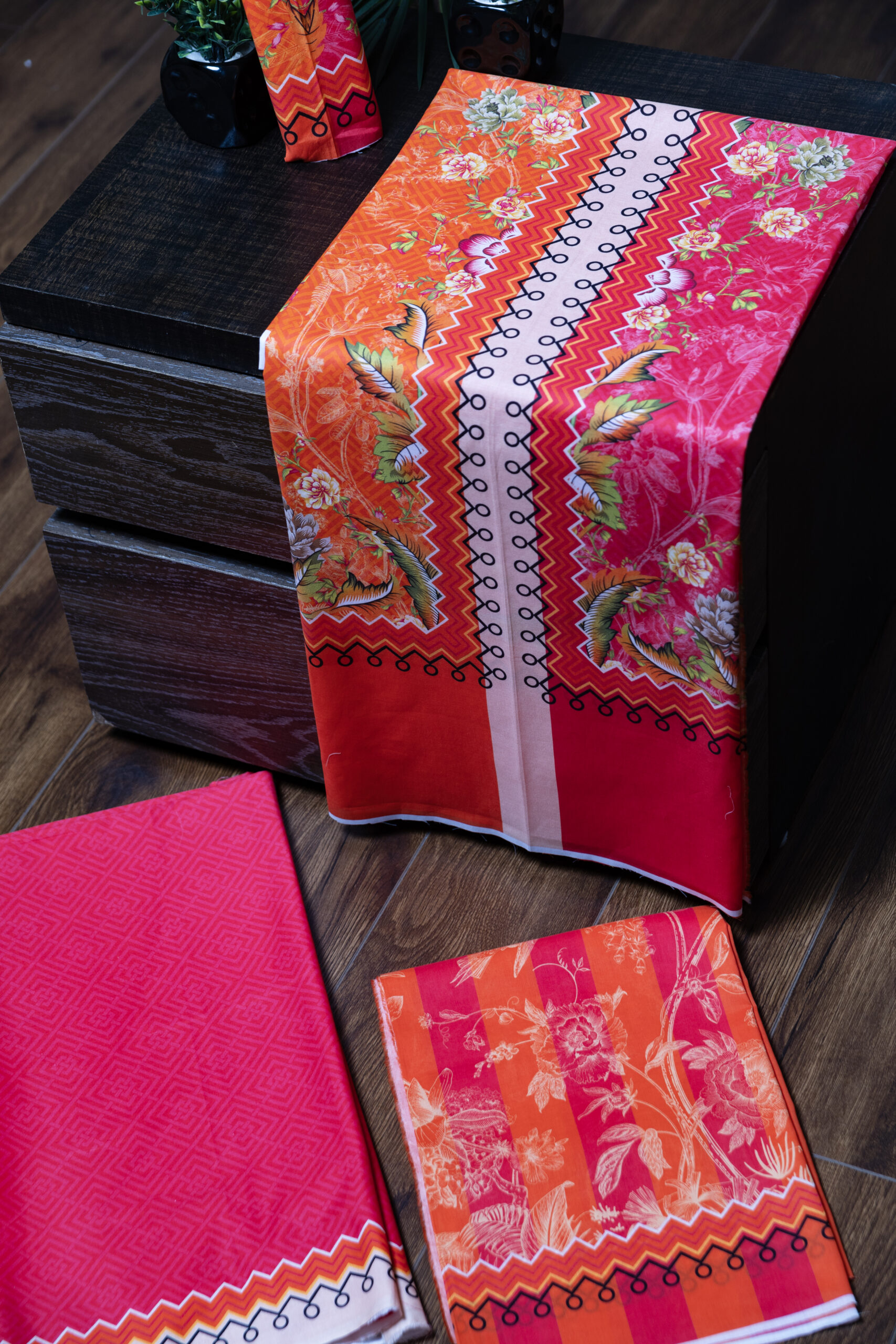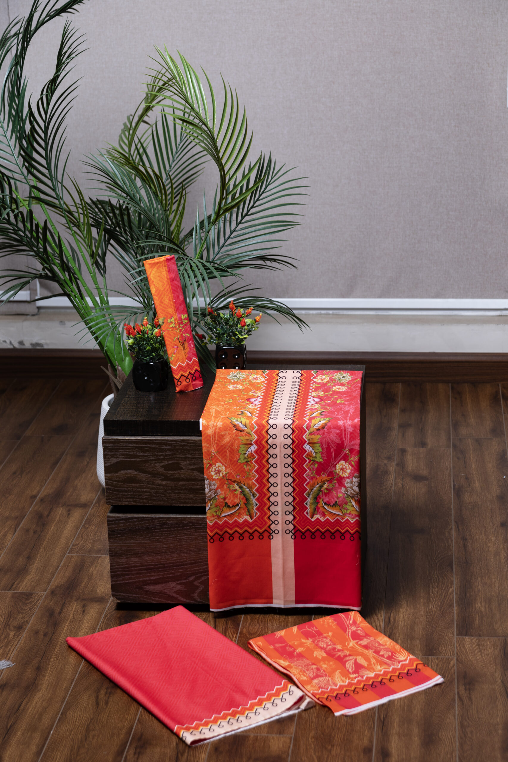 Description: Ignite your creative vision with the radiant Meri Lado 2 Piece Luxury Printed Lawn Unstitched Suit Fabric. This breathtaking material is a celebration of color, featuring a vibrant blend of fiery orange, coral, and deep red, adorned with intricate traditional floral and bird motifs. The design is further energized by bold zigzag patterns and delicate contrast borders. Crafted from premium, soft lawn fabric, this material is wonderfully lightweight and supremely breathable, making it the perfect choice for a custom-tailored summer statement. The two-piece unstitched set includes ample printed fabric for a shirt and coordinating trouser, allowing you to design a personalized suit that perfectly captures your style. Use this fabric to create a stunning, festive ensemble for a special occasion or to bring vibrant elegance to your daily wear.