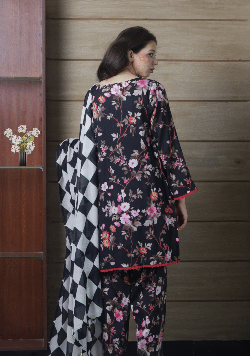 monochrome checkerboard dupatta that instantly elevates the look with a modern, edgy flair, as seen in the back view. Crafted from premium