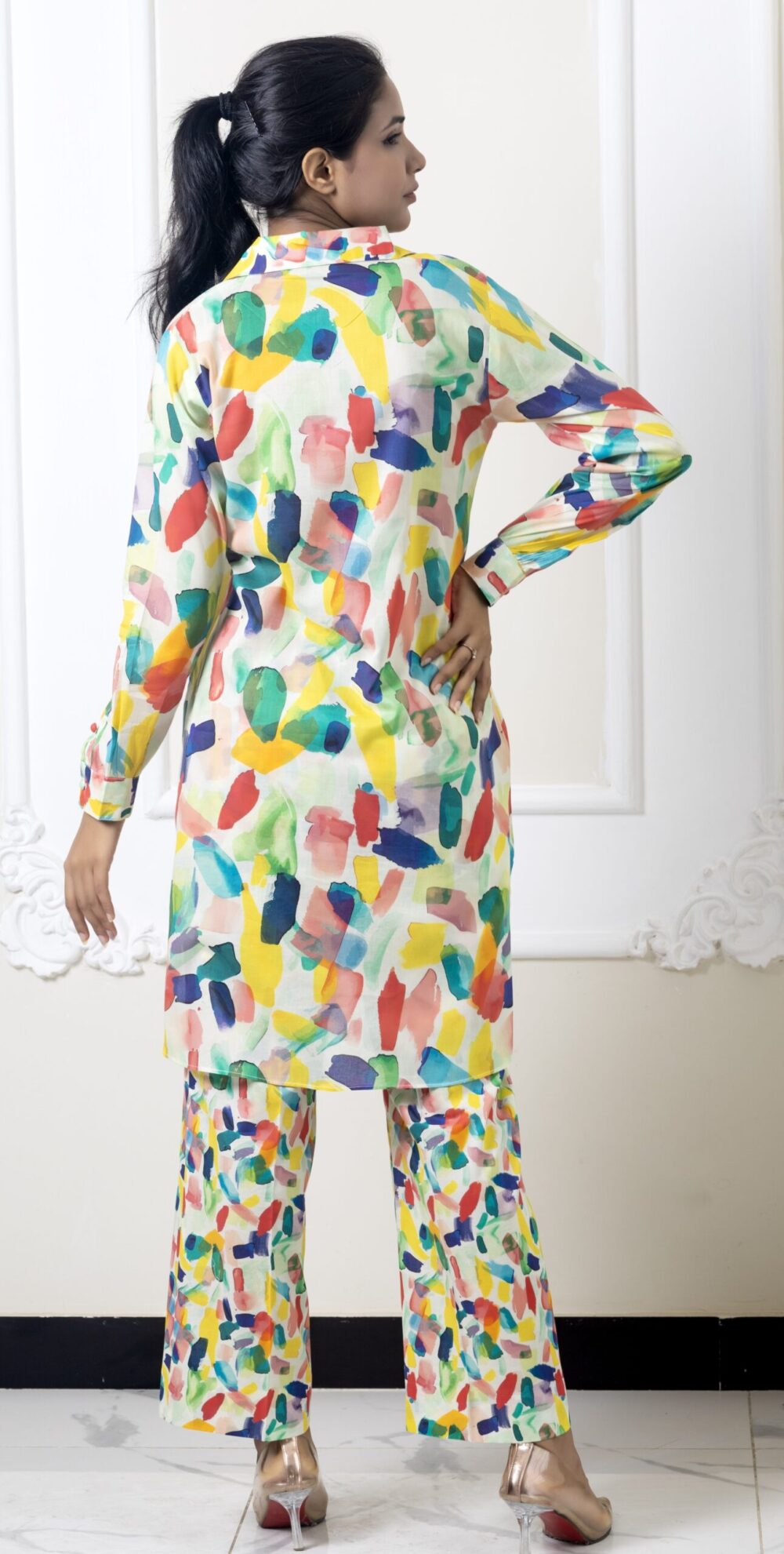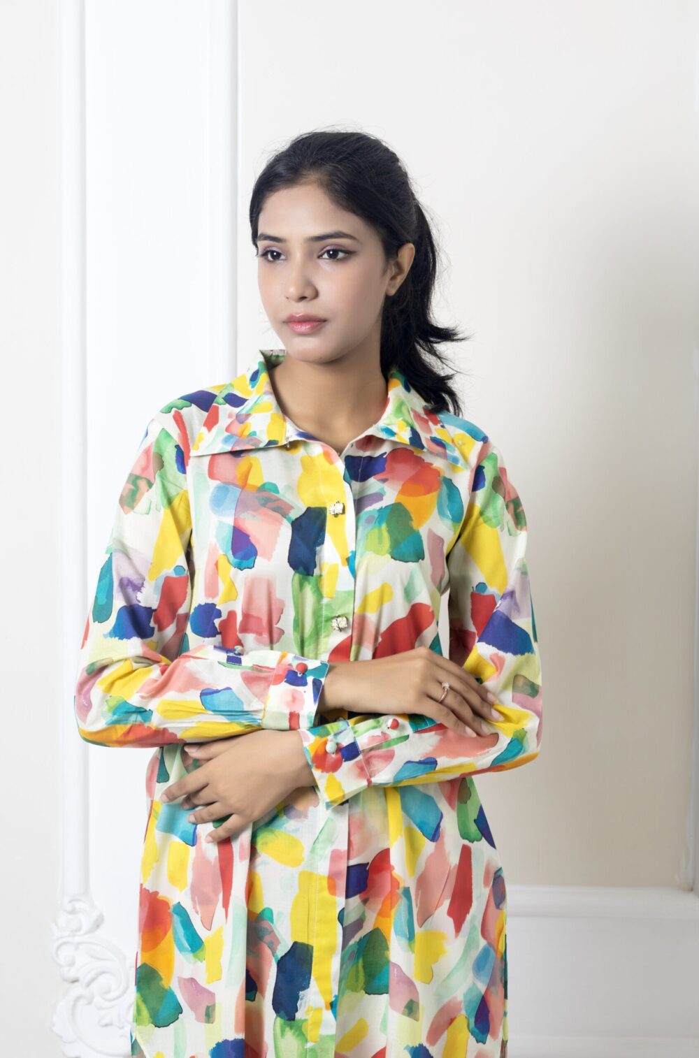 multicolor abstract splash print that resembles a modern painting. The lively palette includes shades of yellow, red, blue, and green, making it a true showstopper.