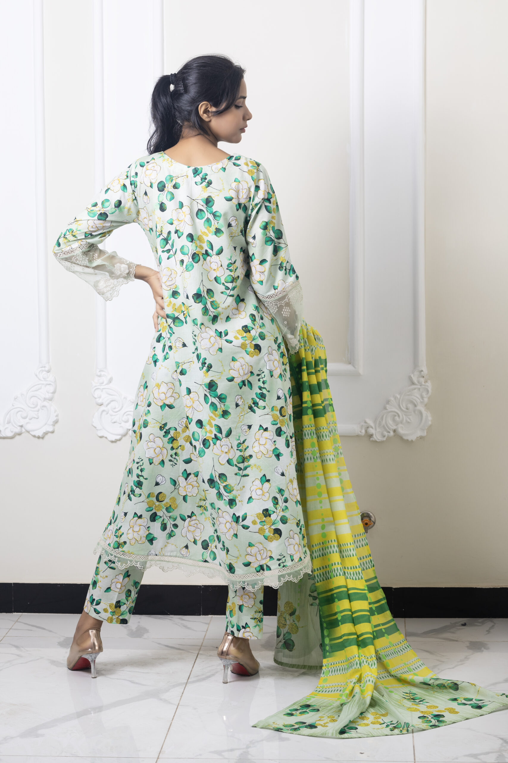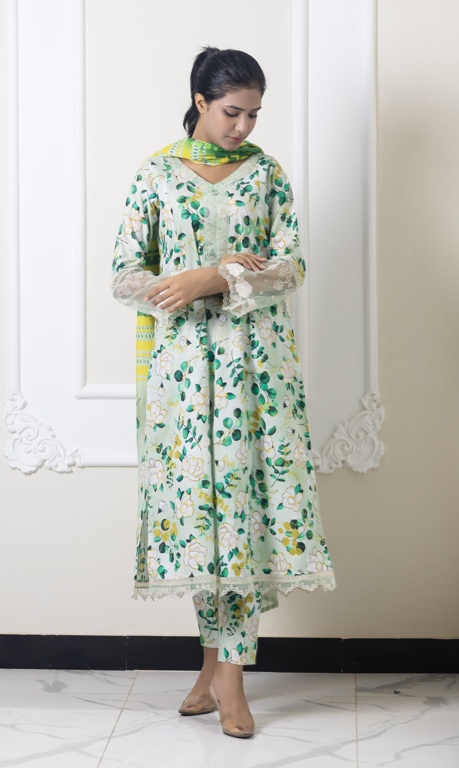 Description: Step into serene elegance with the Meri Lado 3 Piece Luxury Printed Lawn Suit. This enchanting ensemble is built on a refreshing mint green base, beautifully decorated with delicate botanical prints of white and yellow flowers and rich green leaves. The shirt is elevated with exquisite lace detailing along the V-neckline and elegant, flared cuffs. This expertly stitched three-piece suit offers a flattering, ready-to-wear fit, including the beautifully printed shirt, coordinating trousers, and a stunning lawn dupatta. The dupatta features a bold, contrasting striped pattern in vibrant green and yellow, adding a modern flair that perfectly complements the soft floral print. Crafted from premium, breathable lawn fabric, this suit provides sophisticated style and maximum comfort for all your summer events.