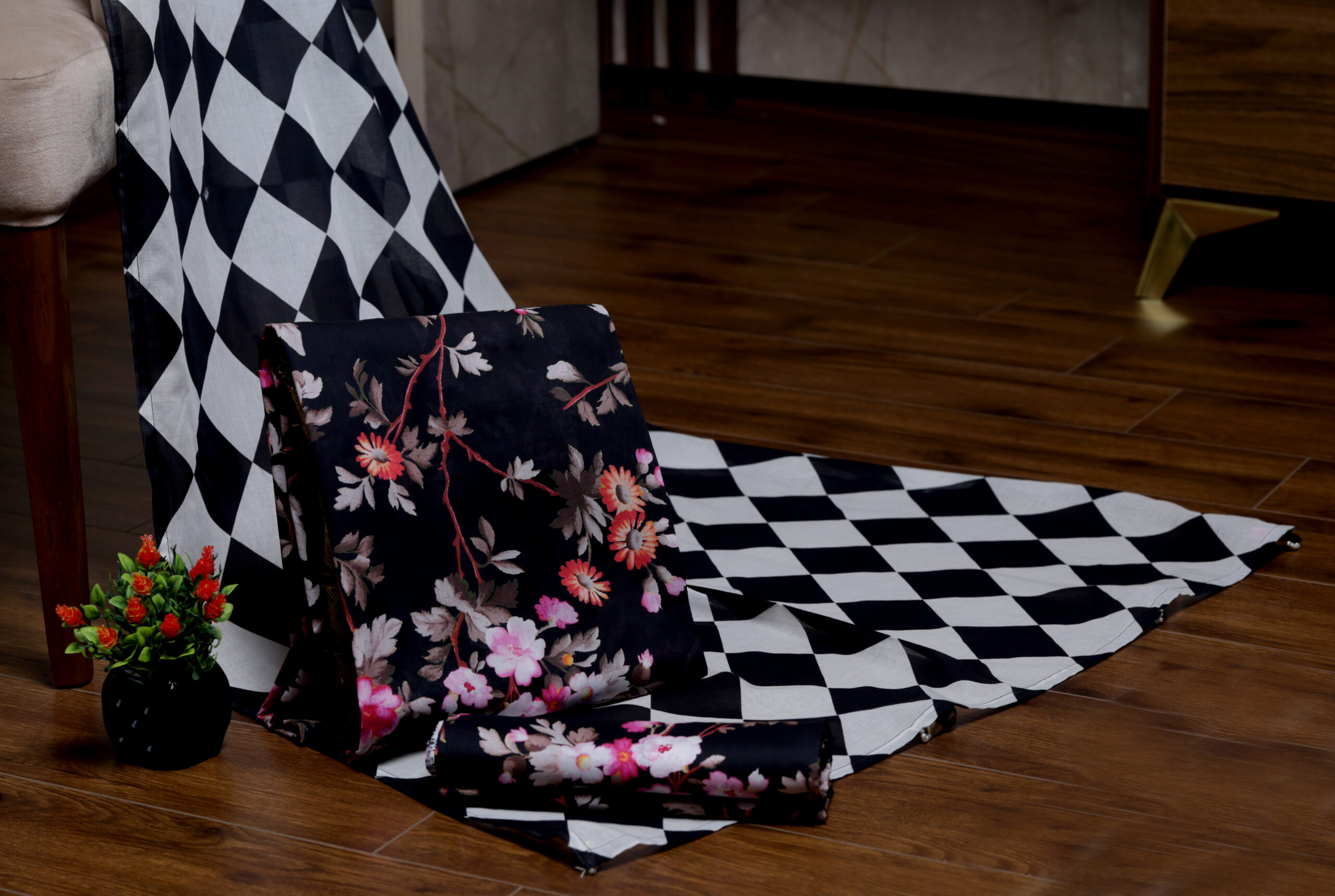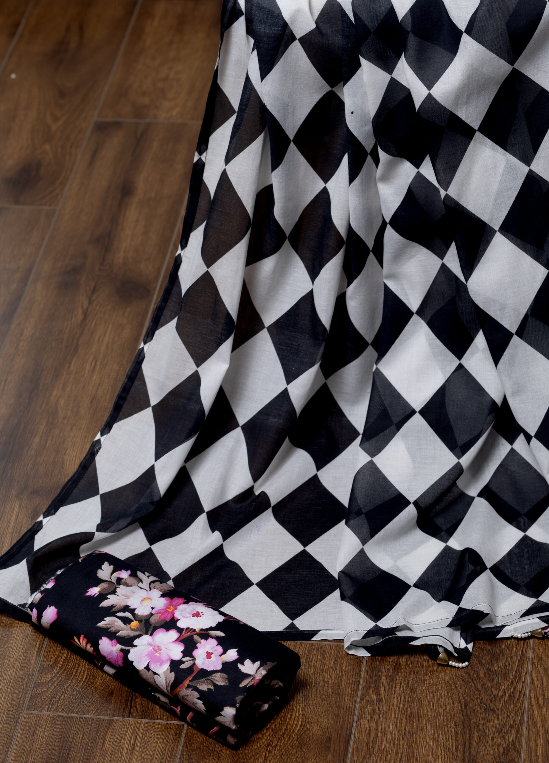 3 Piece Luxury Printed Lawn – Unstitched Black Floral & Checkerboard Suit Fabric