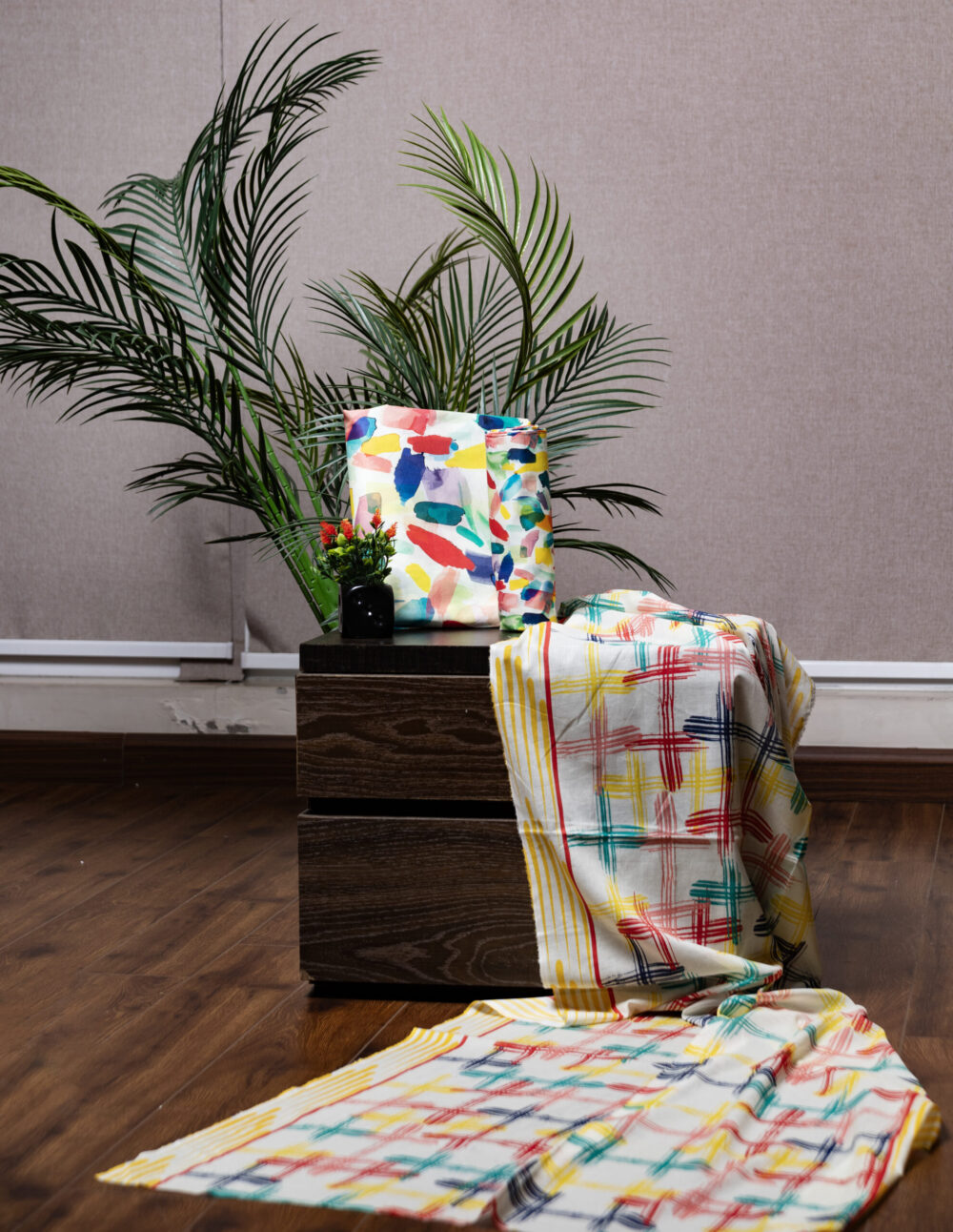 • Design: Abstract splash print for shirt/trousers; abstract plaid design on the dupatta